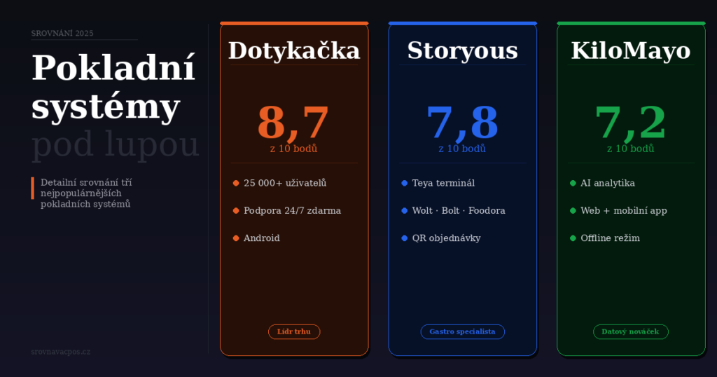 Srovnáváme pokladní systémy za vás. Bezplatně. Rychle. Přehledně. Jednoduše. Náš srovnávač pokladních systémů je unikátní nástroj, který pomáhá českým zákazníkům z oblasti gastronomie, hoteliérství, služeb a retailu s výběrem vhodného pokladního systému. Stačí zodpovědět 5 otázek a srovnávač vám na základě vašich preferencí vybere pokladní systém na míru vašim požadavkům.